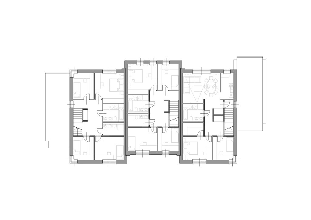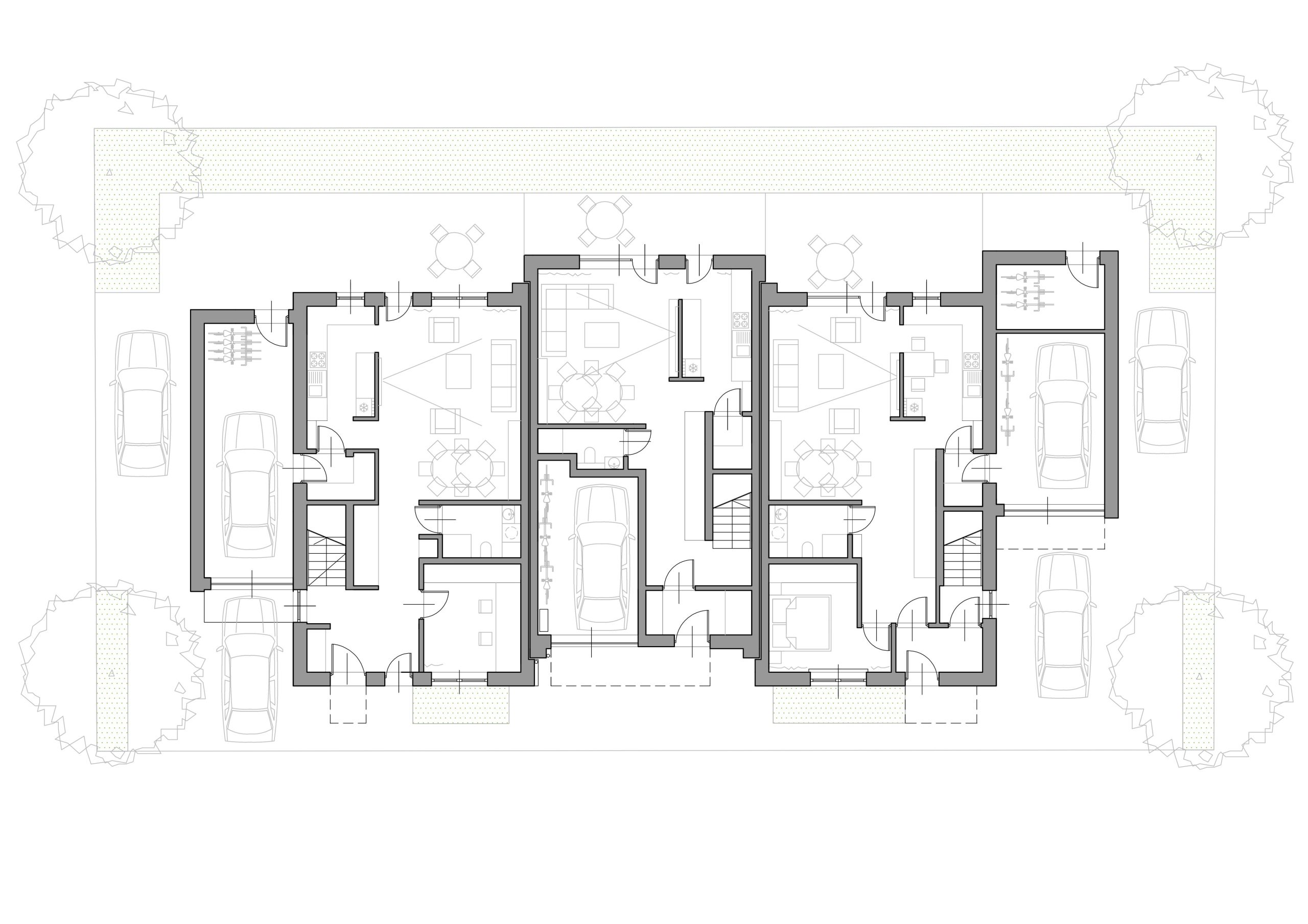 W ramach koncepcji zagospodarowania niewielkiej działki zaprojektowano zespół trzech budynków dwukondygnacyjnych o maksymalnej wysokości dopuszczonej w miejscowym planie zagospodarowania przestrzennego. W układzie funkcjonalnym postawiono na elastyczność i możliwość swobodnej aranżacji wnętrz, z wariantową opcją wydzielenia niezależnych lokali na parterze i piętrze (z osobnymi wejściami). Takie podejście umożliwia adaptację obiektu do zmieniających się potrzeb użytkowników w trakcie jego eksploatacji, przy zachowaniu głównego układu konstrukcyjnego. Bryła budynków z dwuspadowymi dachami, wąskimi elewacjami frontowymi i szczytami zwróconymi w stronę ulicy wprost nawiązuje do tradycyjnej typologii zabudowy.